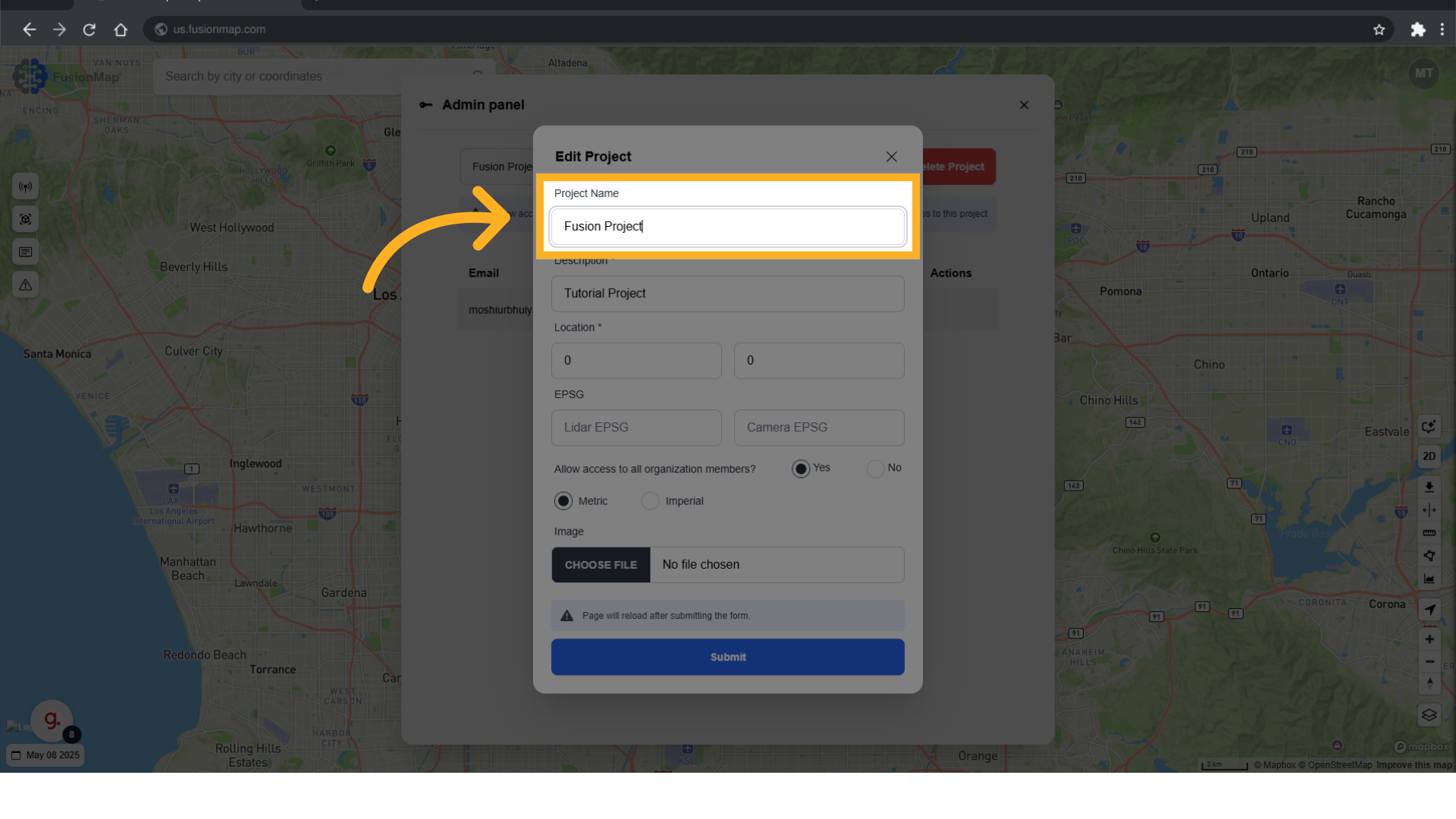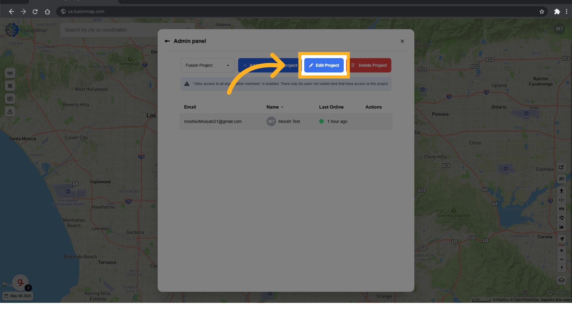 The guide walks the user through changing project settings in FusionMap including accessing the admin panel, modifying project details and adjusting access permissions.